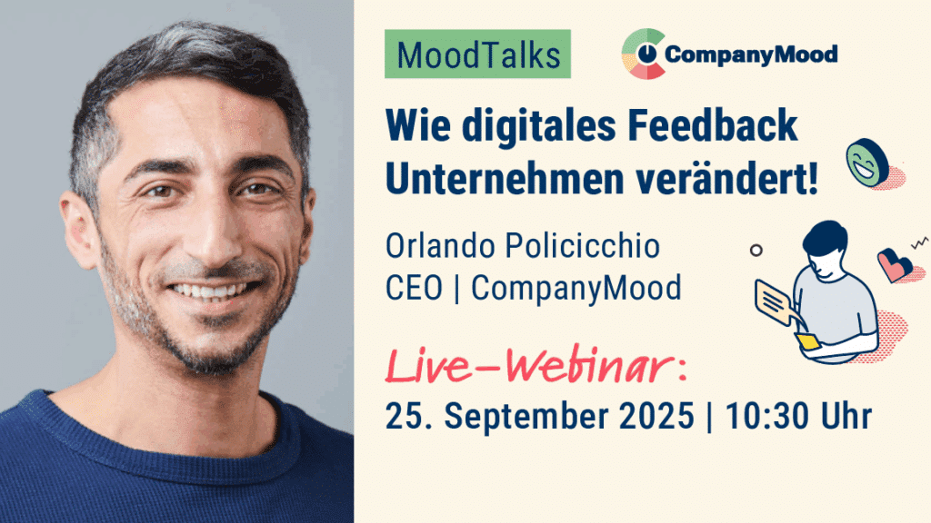 In einer Arbeitswelt, die sich ständig verändert, reicht die klassische Mitarbeiterbefragung alle zwei Jahre längst nicht mehr aus, um Stimmungen, Herausforderungen und Potenziale in Teams zu erkennen. Das zeigte das Webinar „Wie digitales Mitarbeiterfeedback Unternehmen verändert“, moderiert von Matthias Friedrich und präsentiert von Orlando Policicchio, Mitgründer und Geschäftsführer von CompanyMood.