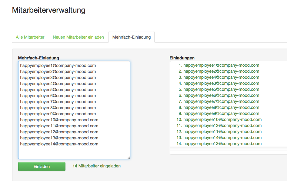 Die Mehrfach-Einladung ist in einem gesonderten Tab angeordnet und wird zum schnellen Einladen einer großen Anzahl von Mitarbeitern genutzt.